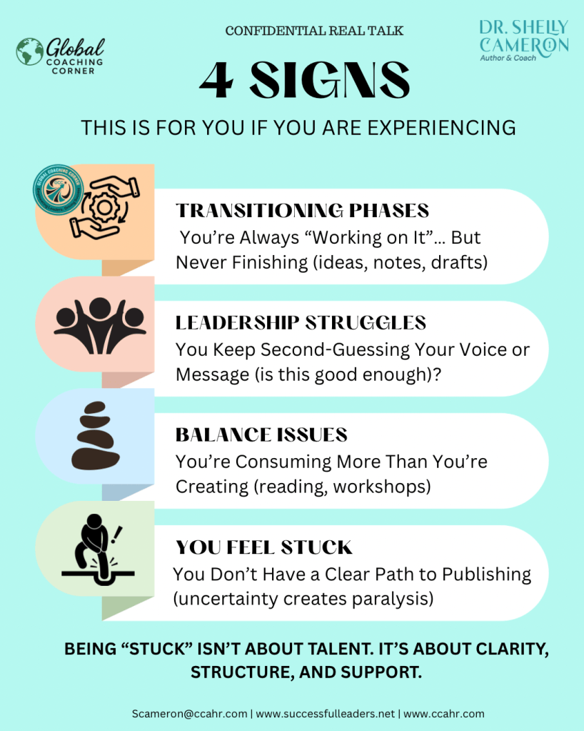 Know that being “stuck” isn’t about talent, it’s about clarity, structure, and support. As an author of 11 books, I have been there and now teach the process throughout different communities. If you identified with any of the signs and need help, let’s connect now and get you moving. Clarity is on the other side of the ‘Ask’.